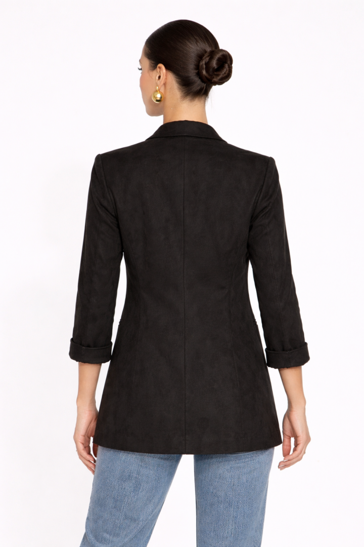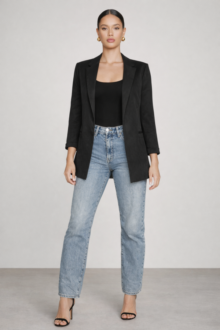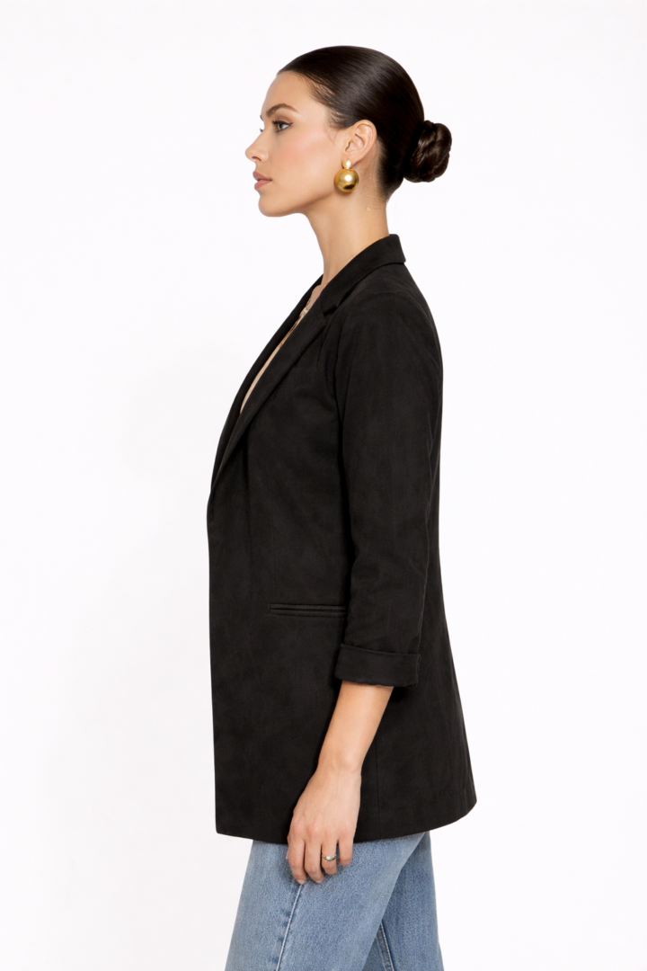 Elevate your everyday wardrobe with this black faux suede blazer jacket designed for effortless layering and timeless style. This lightweight women’s blazer delivers a polished silhouette while remaining soft, breathable, and comfortable. Because the fabric has a smooth faux suede finish, it creates a luxe look that feels elevated yet easy to wear. Moreover, the open front design allows for relaxed styling, so you can pair it with jeans, dresses, or workwear staples.