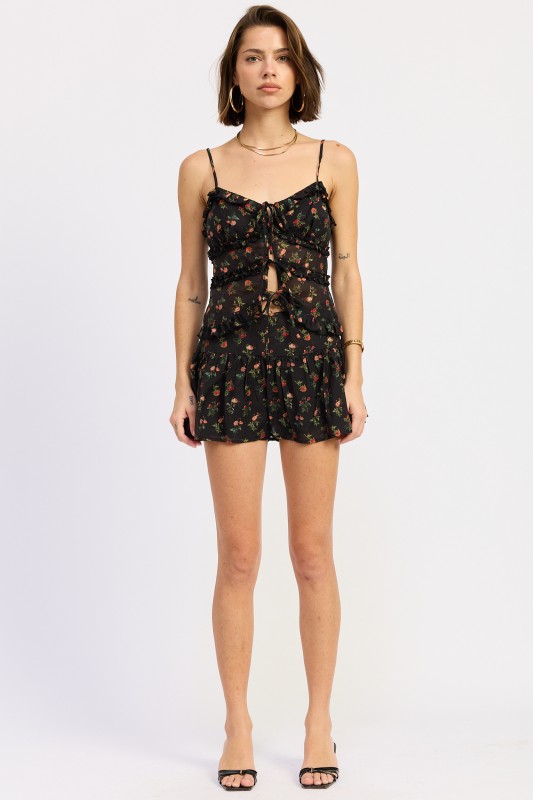 Black floral ruffle cami. Additionally, the adjustable spaghetti straps allow for a customizable fit, which enhances comfort while maintaining a delicate boutique aesthetic. The front tie detail adds a playful touch, yet it still feels elegant and wearable. Because of this balance, the top transitions easily from daytime brunch outfits to evening date looks.