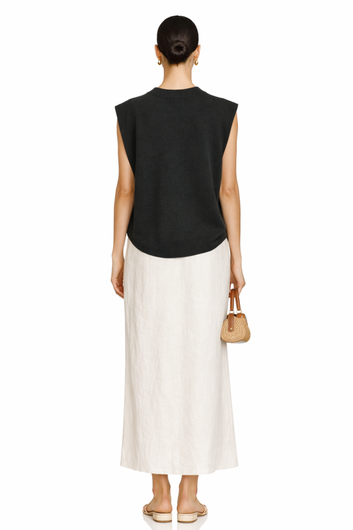 The round neckline creates a clean, minimalist silhouette. Meanwhile, the relaxed fit allows easy styling over shirts, dresses, or fitted tops. Additionally, the modern cropped length pairs beautifully with high-waisted trousers, denim, or skirts. Consequently, this sweater vest becomes a capsule wardrobe staple that transitions seamlessly from casual daytime looks to elevated evening outfits.
