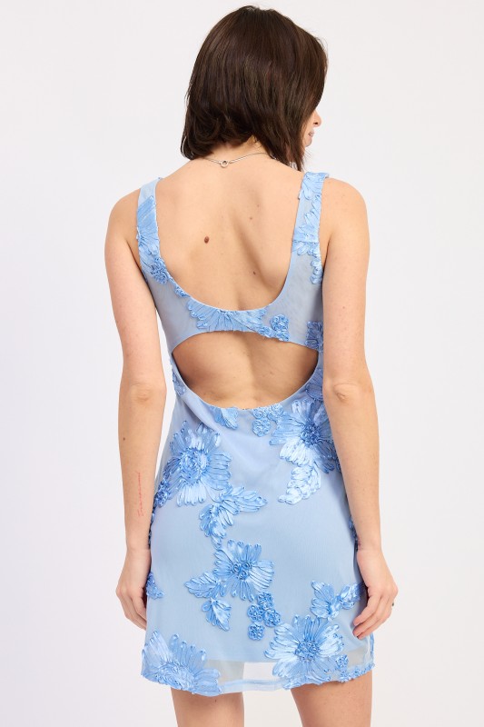 Blue Floral Mesh Mini Dress. Meanwhile, the square neckline enhances the overall silhouette by highlighting the collarbone and shoulders. This neckline remains one of the most searched styles for modern dresses because it offers both structure and sophistication. Furthermore, the open back design adds a stylish and unexpected detail. This feature gives the dress a fashion-forward feel while maintaining a balanced and flattering fit.