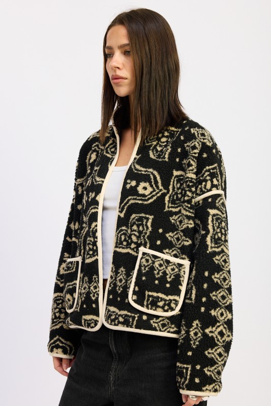 Boho Paisley Sherpa Jacket. Moreover, the black and cream palette makes it a dream piece for women building a neutral capsule wardrobe for fall and winter. Because it works for both cozy at-home layering and dressed-up casual outings. It becomes a jacket you’ll reach for again and again. As a result, this paisley sherpa jacket delivers everything your customers are searching for — warmth, texture, and effortlessly cool fall outfit energy.