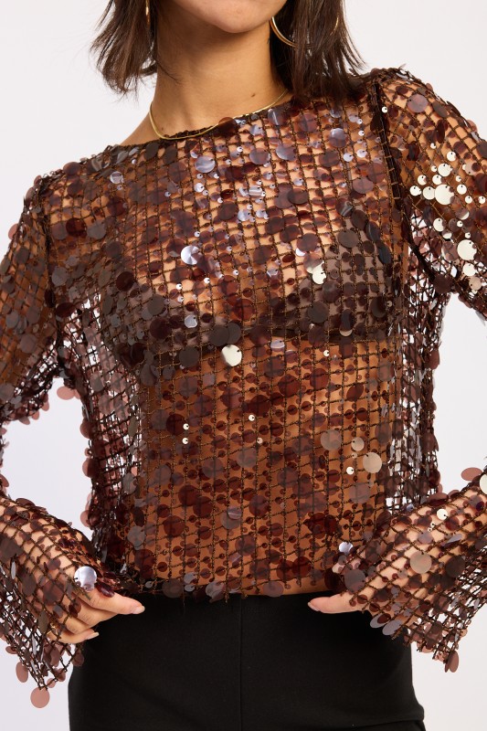 This brown sequin mesh top is designed to turn every outfit into a statement look. Because sparkle is trending in party fashion, this long sleeve sheer top instantly elevates night out styling. The lightweight mesh fabric creates a breathable feel, while the all-over sequin disc detailing adds eye-catching shimmer from every angle.