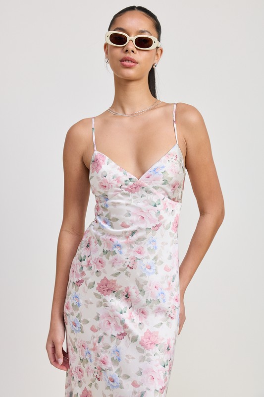 A romantic ivory floral maxi dress featuring delicate spaghetti straps, a flattering V-neckline, and a soft satin slip silhouette. Perfect for spring weddings, baby showers, brunch dates, and vacation outfits.