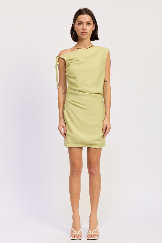Crafted from a lightweight woven fabric, this mini dress feels breathable and comfortable from day to night. Additionally, the asymmetrical neckline creates a flattering frame across the shoulders, while the adjustable side tie detail allows for a customizable fit that hugs in all the right places. As a result, the dress drapes beautifully along the body without feeling restrictive or tight.