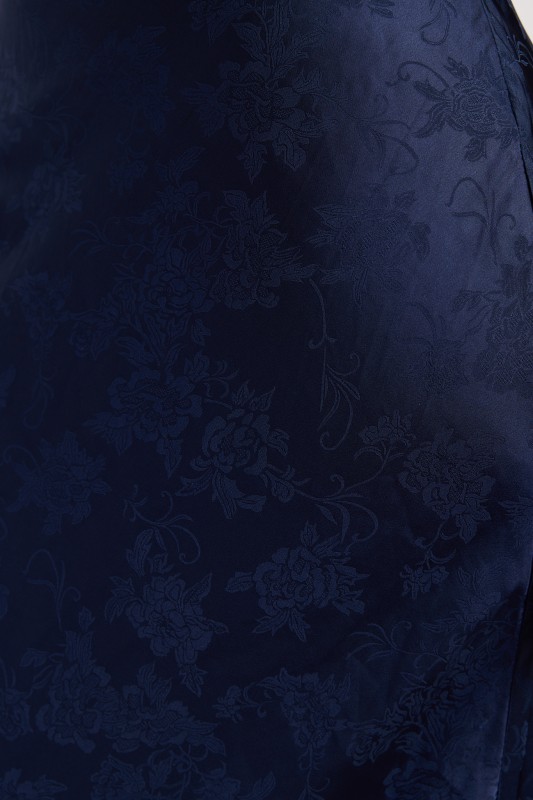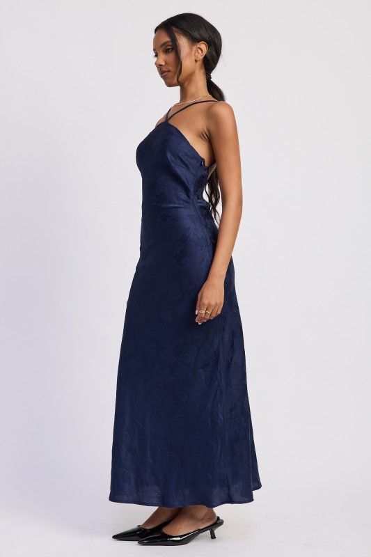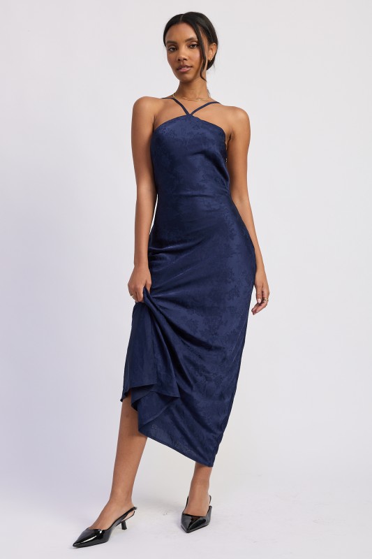 Navy satin halter maxi. This navy maxi dress is perfect for wedding guests, cocktail parties, date nights, and upscale dinners. Additionally, the adjustable back tie ensures a customizable fit, so you feel confident and secure. The lightweight satin flows beautifully as you walk, creating graceful movement with every step. Although the design is minimal, the tonal floral texture adds dimension and luxury.