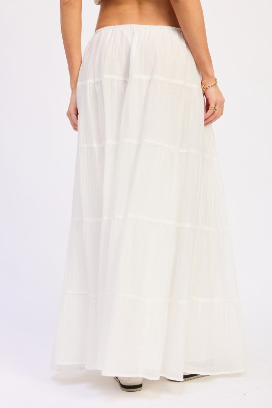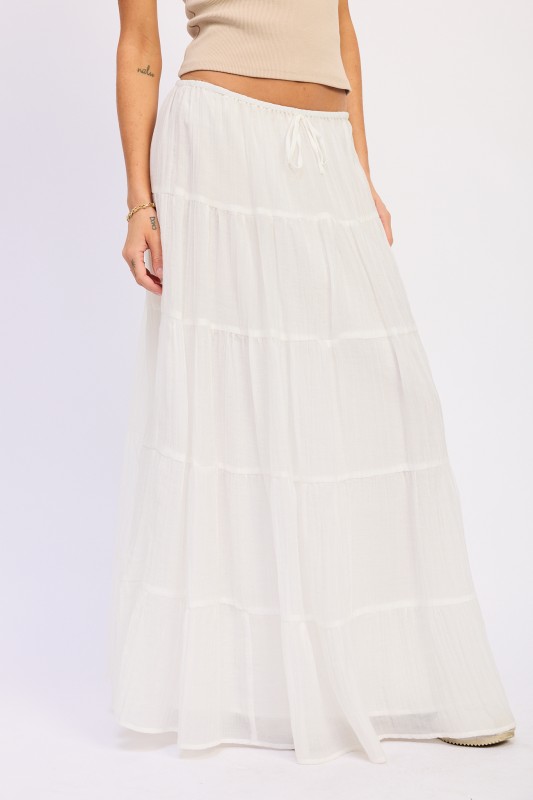 - Off white tiered maxi skirt with lightweight, flowy fabric