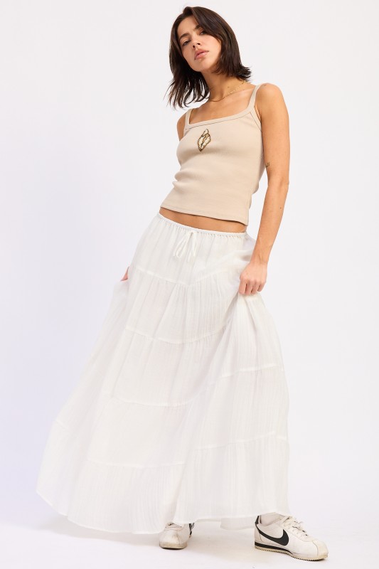 Off white tiered maxi skirt. What sets this skirt apart, however, is the subtle charm detail, which adds a delicate, elevated touch. As a result, this piece transitions seamlessly from casual daytime outfits to more styled, put-together looks. Whether you are heading to brunch, planning a vacation outfit, or simply looking for an easy everyday staple, this skirt works effortlessly for every occasion.