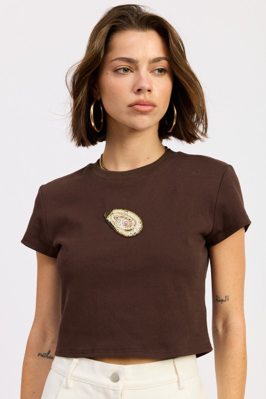 Meet the Oyster Embroidered Baby Tee, a modern essential designed for effortless everyday styling. This cropped baby tee blends clean lines with subtle coastal charm, making it a standout staple in any trend-forward wardrobe. Available in versatile oat and rich brown, this fitted tee transitions seamlessly from casual daytime looks to elevated off-duty outfits.