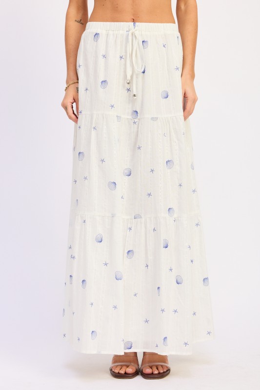 White maxi skirt with blue seashell print design