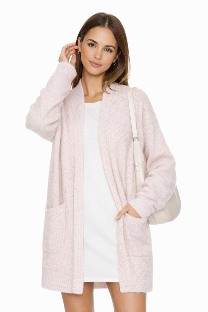 Meet your new go-to layering essential. This soft blush knit cardigan is designed to elevate everyday outfits while keeping your look effortless and cozy. Crafted from a lightweight yet plush knit, this cardigan drapes beautifully over the body without feeling bulky. Because of its relaxed fit and clean lines, it’s perfect for styling from season to season.