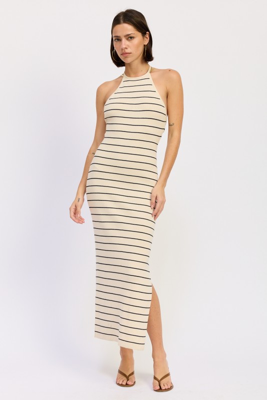 Striped Open Back Midi. The halter neckline draws attention upward, while the open back with adjustable tie detail adds an unexpected, eye-catching finish. As a result, this dress feels elevated yet easy to wear. Furthermore, the midi length and side slit offer just the right amount of movement, making it perfect for day-to-night styling.