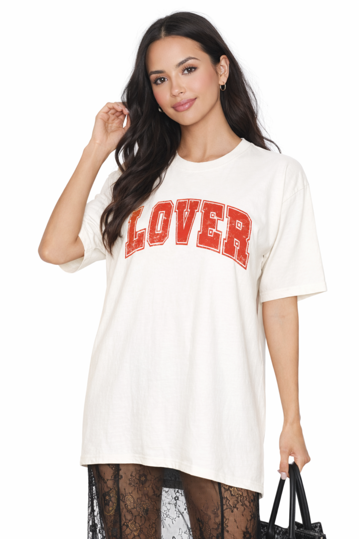 Ivory graphic tee with bold red “LOVER” print