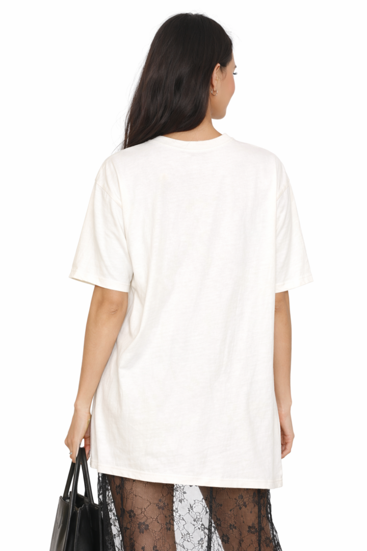 The oversized silhouette creates endless styling possibilities. Pair it with faux leather shorts for an edgy Valentine’s look, or wear it with denim, leggings, or lace layers for an elevated everyday outfit. For cooler days, simply layer it under a blazer, cardigan, or denim jacket. Therefore, this tee transitions seamlessly from winter into spring.